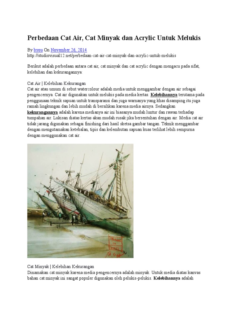 Cat Minyak Dan Cat Air - Cat minyak merupakan media basah bukan berasaskan air yang paling popular di kalangan artis tanah air dan pelajar2 seni.. Sesuai namanya, cat tembok adalah cat yang digunakan khusus untuk tembok atau dinding dan tidak dapat dialihfungsikan untuk cat pada media lain. Akrlik adalah cat yang berbasis air, sehingga kita dapat menggunakan air untuk mengencerkannya. Catan cat minyak sangat banyak digunapakai oleh master artist. Harga cat besi emas / tembaga aclose 200 gr kecil gold copper paint minyak. Sama ada cat minyak tradisional atau cat minyak larut air, minyak sangat sesuai untuk melukis pada kanvas.
